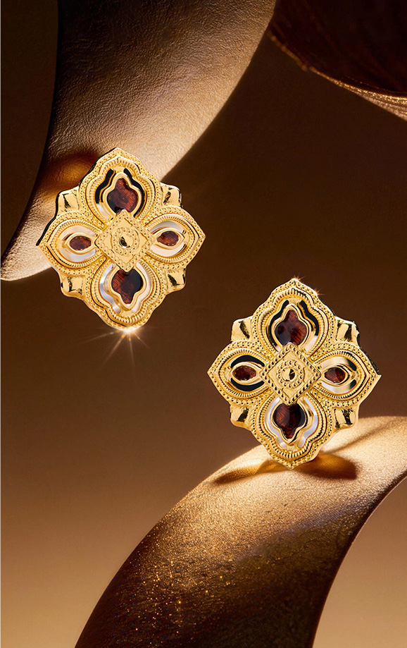 CNC工艺精雕出欧洲古典玑镂纹理,半透明虎睛石色珐琅,精密镶嵌高净度钻石, 绽放璀璨火彩,恒久闪耀,寓意事事如意、四合如意、四时和美。