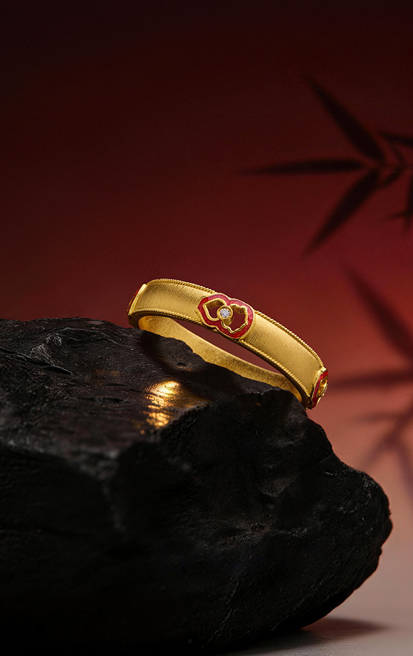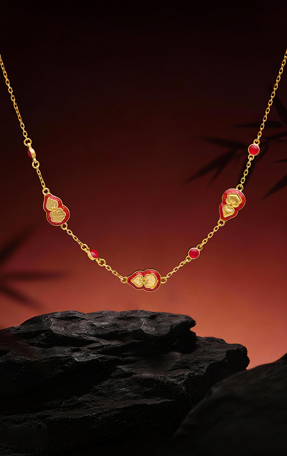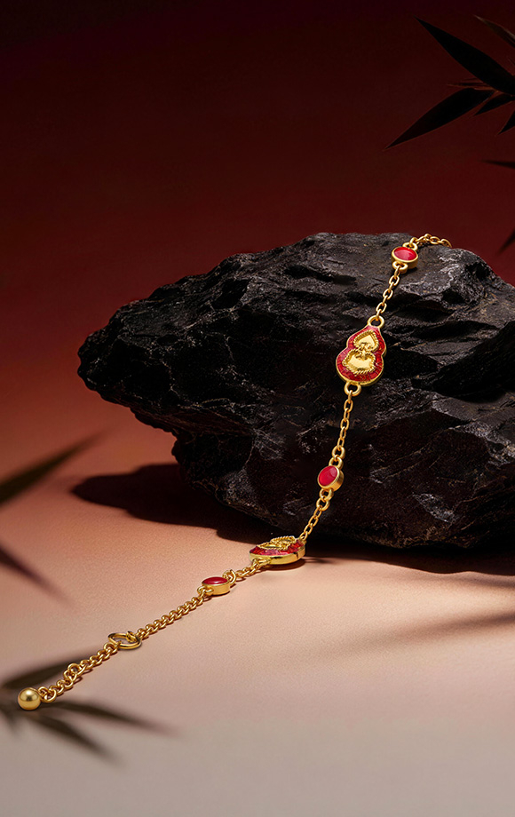 圆润的轮廓,装满顺遂与安康,流畅的线条,勾勒出如意与美满,以灵动葫芦为形, 红珐琅镶嵌,如灵动火焰,为整体增添一抹热烈与吉祥,与金色相得益彰,诉说福禄双至的喜悦。