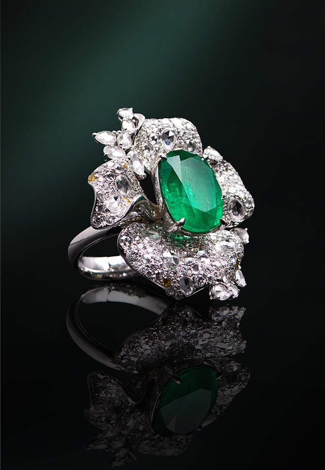 饱满澄澈的祖母绿主石 犹如初春绿意盎然的生命气息 以柔美线条勾勒轮廓,辅以精致镶嵌 再现繁花盛放的灵动姿态