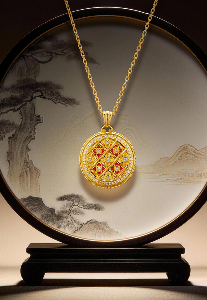 罗盘中描绘盛开的花瓣,花心点钻,美轮美奂,诠释东方古典美学,尽释奢雅气质, 缂丝工艺赋予金面丝绒质感,圆佩流转间,藏着“双面人生,两面皆美”的巧思。